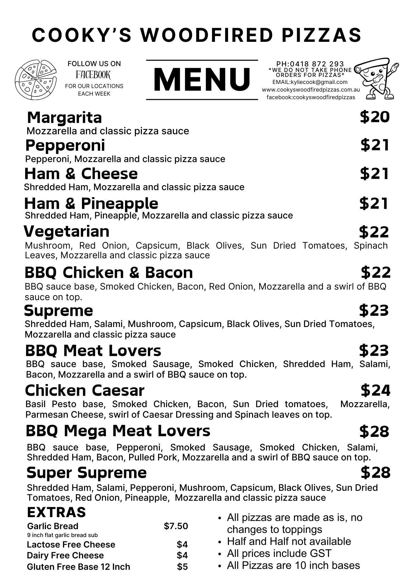 Our menu will only include the following pizzas. Margarita, Pepperoni, Ham and Cheese, Ham and Pineapple, Vegetarian, BBQ Chicken and Bacon, Supreme, BBQ Meat Lovers. We also have cold drinks for Festivals. We will not have any allergy food or Garlic Bread available on these days due to the high risk of cross contamination for allergies when it's very busy. If you are attending an event and would like an allergy friendly pizza please get in contact with us the day before the event and we will be happy to make your pizzas separately and cook at the start of the event for you. All pizzas are made as per the menu for events and changes are not possible.